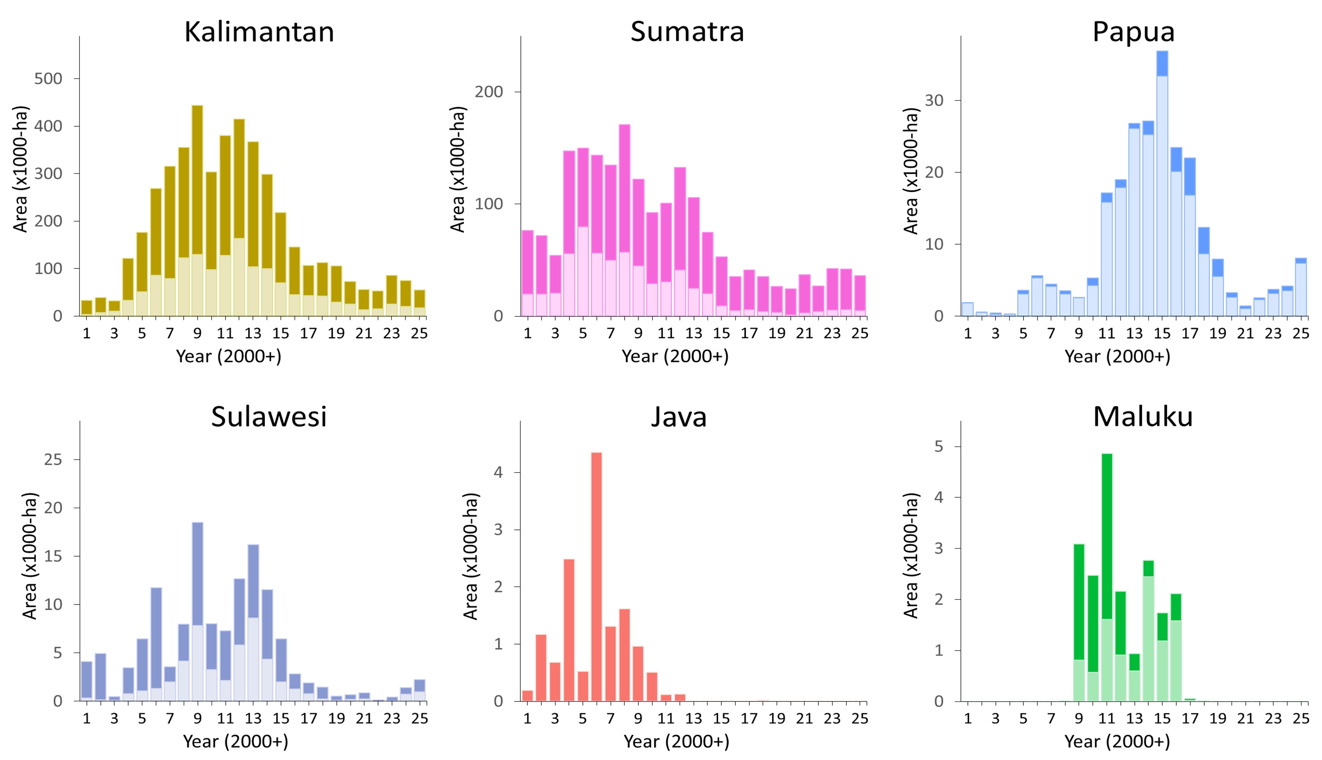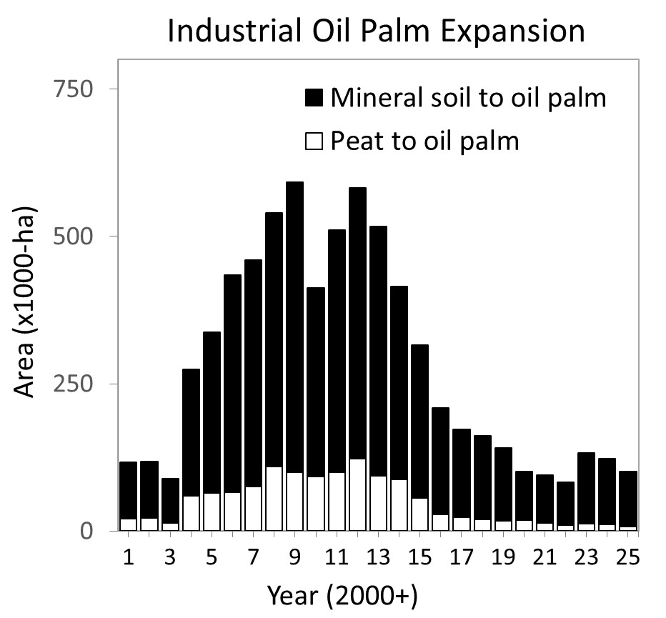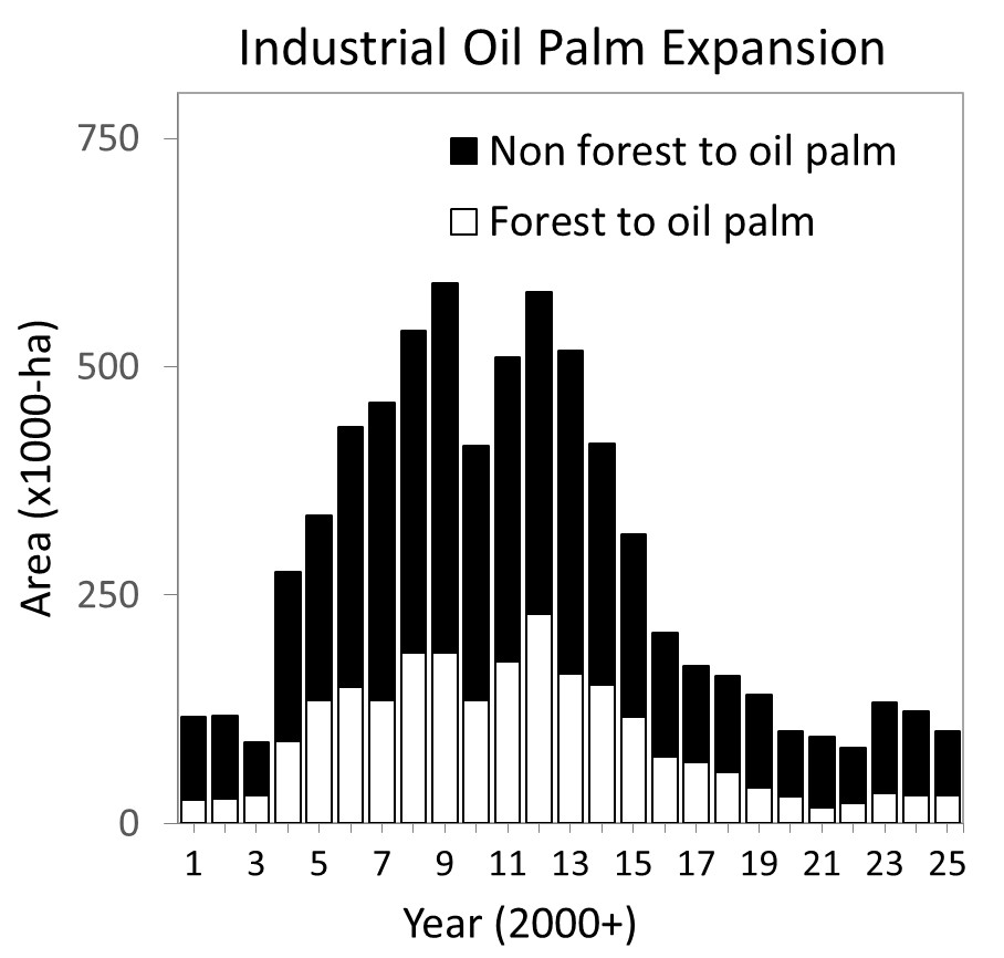 At the regional level, both plantation expansion (light and dark bars; Figure 2) and associated deforestation (light bars; Figure 2) declined in Kalimantan and Sumatra; but increased in Papua, and to a lesser extent in Sulawesi.