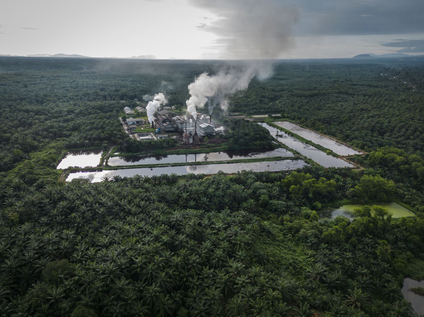Industrial palm oil mill surrounded by large-scale oil palm plantations in Kalimantan Palm-Oil-Driven Deforestation Stable in Indonesia in 2025 but Doubles in Papua